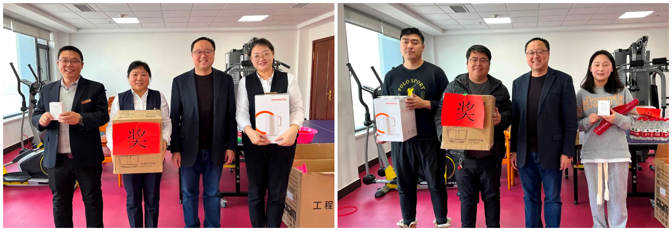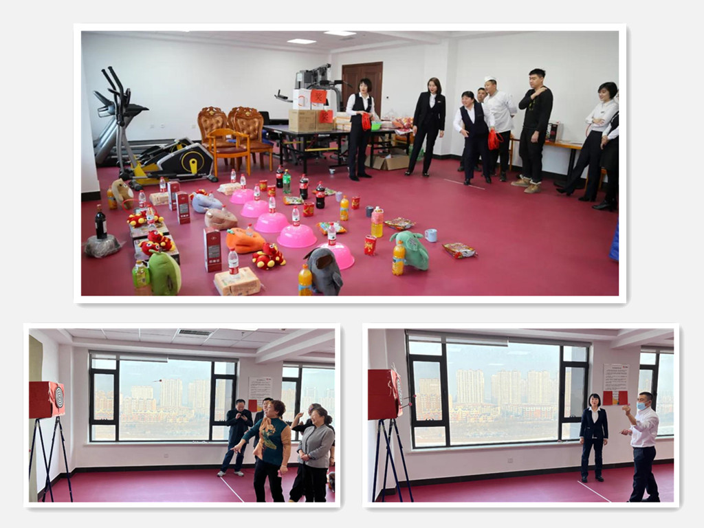 套圈活動現場,福字、春聯、飲料、保溫杯、抱枕、餐具套裝等等,還有價值2000元的紅酒,隨著一聲聲歡呼,參加活動的同事滿臉笑容的一堆堆套走。飛鏢靶前,屏氣凝神,大家為投手吶喊助威。