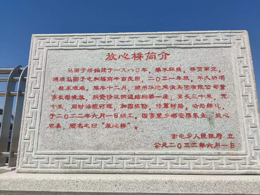 錦州華地建設集團董事長薄曉放,得知了這一消息后,非常惦念家鄉父老,立即決定捐建一座橋,以解決家鄉人們出行難的問題。因寄望鄉鄰安居樂業,放心農桑,故取名放心橋。